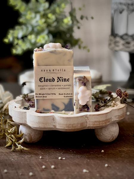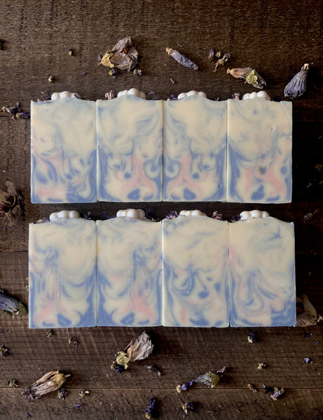 Description:  Like drifting in a state of pure euphoria, this bar will have you floating somewhere just above the clouds.  Sparkling bergamot, clementine, and pomelo lift the scent with a citrusy glow—crisp, juicy, and sunlit. Hints of fresh apple and soft apricot add a gentle airy sweetness.  Formulated with a combination of coco butter, mango butter and colloidal oats for extra gentle and moisturizing benefits.  Includes skin safe mica colorant, titanium dioxide and topped with oats and lilac petals.