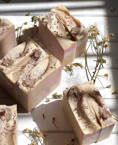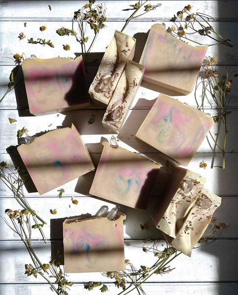 Description: Enter the Garden of Eden with the these spring inspired soap bars. Scented with notes of violet, lily, orchid, heliotrope, gardenia, honey, plum, amber, vanilla and musk. Made with hydrating and nourishing oils and butters. Topped with dried heather flowers and one clear quartz stone for an ethereal touch.