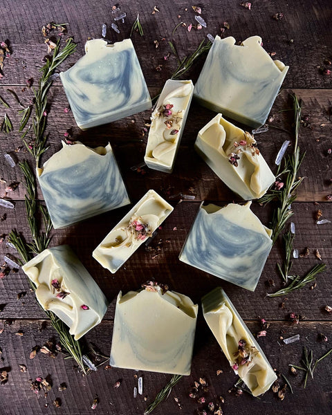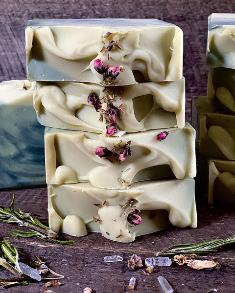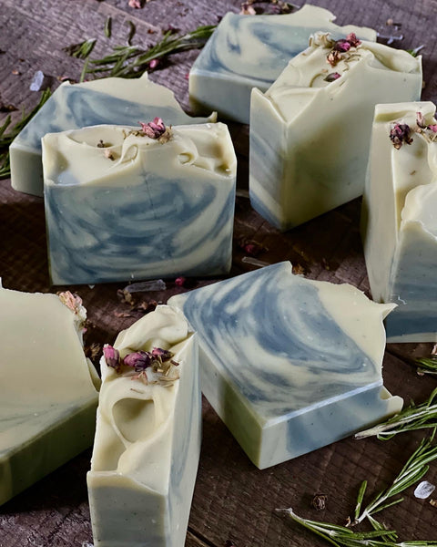 Description: Inspired by wild greens in the sunny forests of Italy, these bars are made with rosemary infused oils and menthol crystals for an invigorating and refreshing cooling affect.  French green clay and indigo powder give it its natural coloring.  Scented with an essential oil blend of rosemary, peppermint and lime.  Topped with dried rosemary and peach buds.