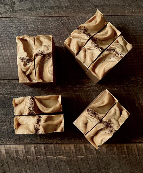 Description: This is for our coffee lovers! Made with coffee everything including fresh brewed coffee, coffee seed oil, coffee extract, coffee butter, cocoa butter, vanilla bean and cocoa powder. The added coffee grinds makes for a nice scrubby bar that's perfect for exfoliation. Scented with notes of roasted coffee beans, rolled oats, coconut, cream, cardamom, cinnamon, vanilla, maple sugar, and just a small touch of heliotrope, tonka bean, and ginger.