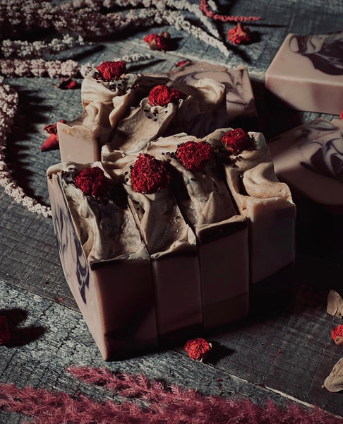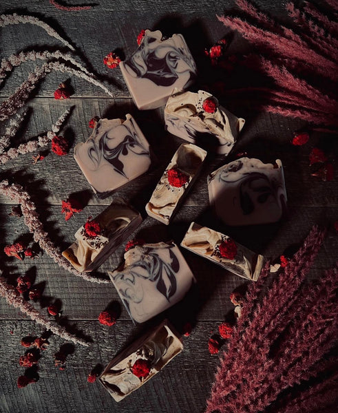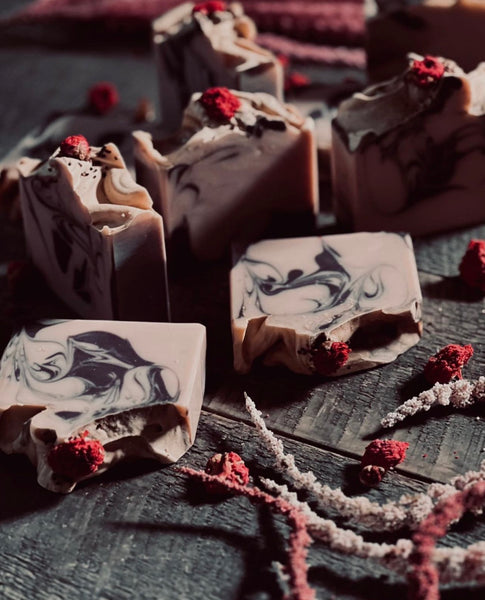 Ingredients: Olive Oil (Olea Europaea), Coconut Oil (Cocos Nucifera), Rice Bran Oil, Castor Seed Oil (Ricinus Communis), Cranberry Butter, Shea Butter, Kaolin Clay, Rose Extract, Coconut Milk, Water (Aqua), Lye (Sodium Hydroxide), Citric Acid, Sodium Lactate, Titanium Dioxide, and Skin Safe Mica Colorants. Phthalate Free Fragrance.